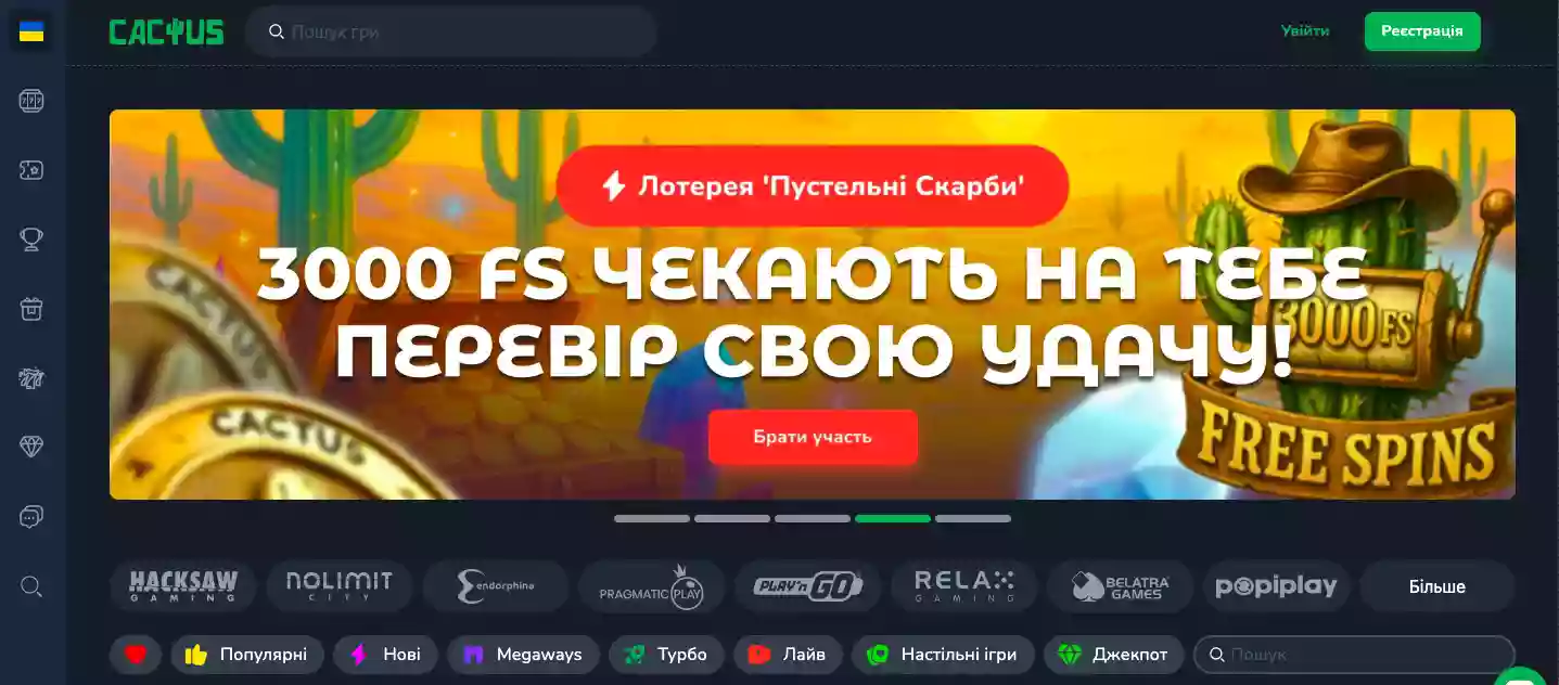 | Cactus Casino | 2024 | Кюрасао (Curacao) | Так (BTC, ETH, USDT, USDC, LTC, TON тощо) | ≈9 500+ ігор | Вітальний пакет на 3 депозити – 1-й: 200% до €1000 + 200 Spins; 2-й: 150% до €750 + 150 Spins; 3-й: 100% до €500 + 100 Spins | Висока надійність (8/10 експертна оцінка; Індекс безпеки 8.5/10) |