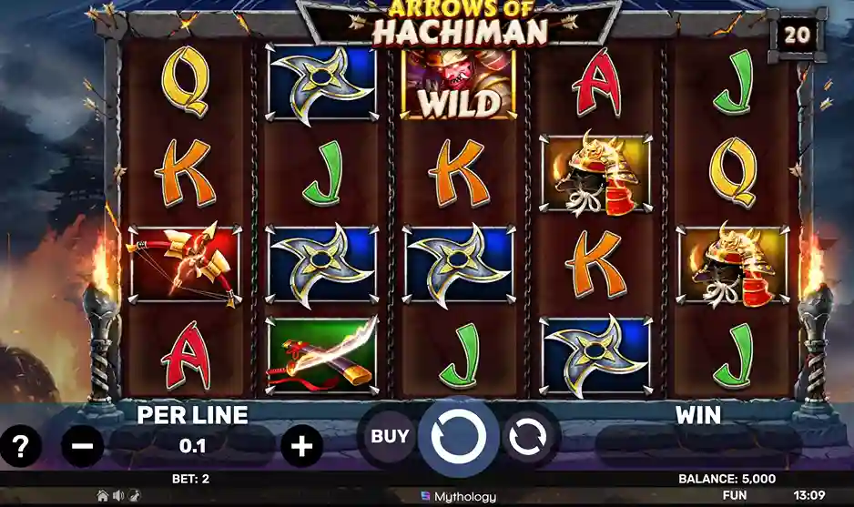 Arrows Of Hachiman із п’ятьма барабанами та двадцятьма активними лініями виплат, випущений у 2025 році. Тематика гри занурює гравця у світ японської міфології, зокрема до образу бога війни Хачімана. Слот має високий рівень волатильності та RTP на рівні 95.7%. Діапазон ставок коливається від 0,2 до 10.