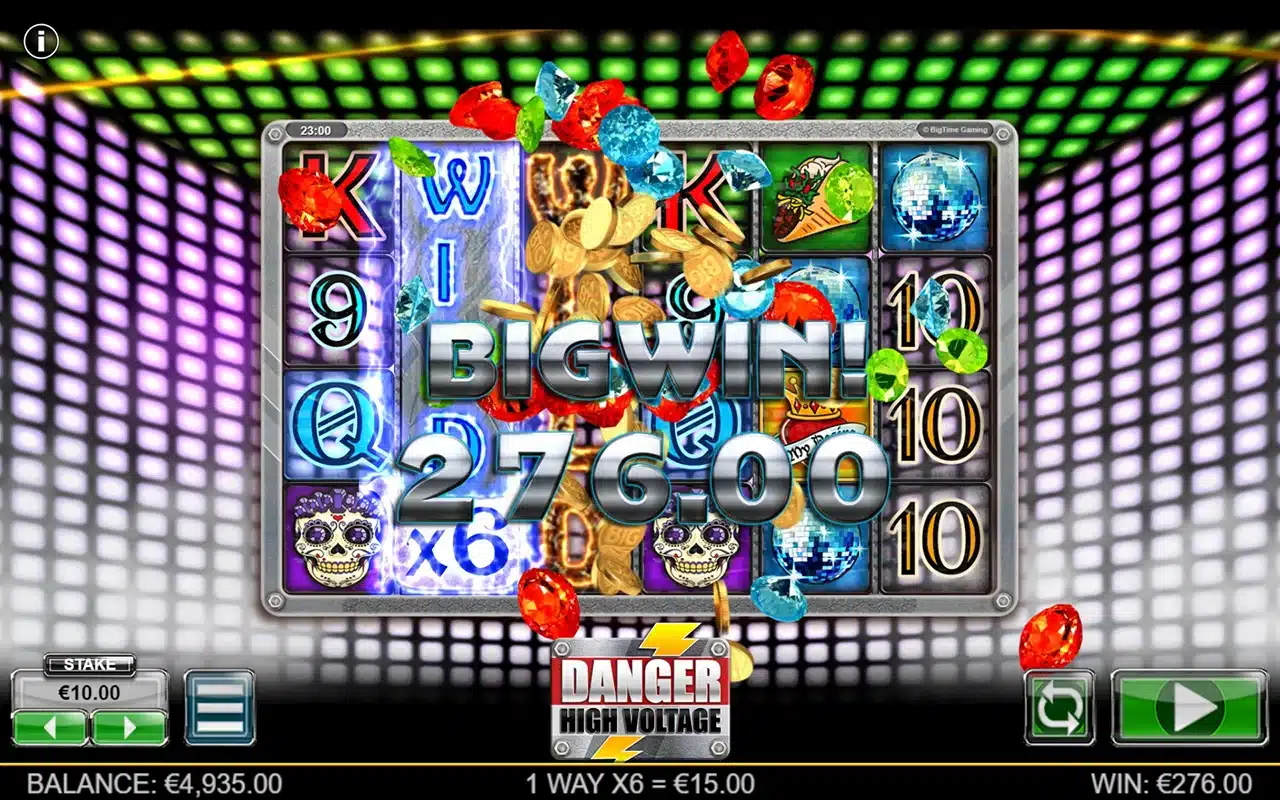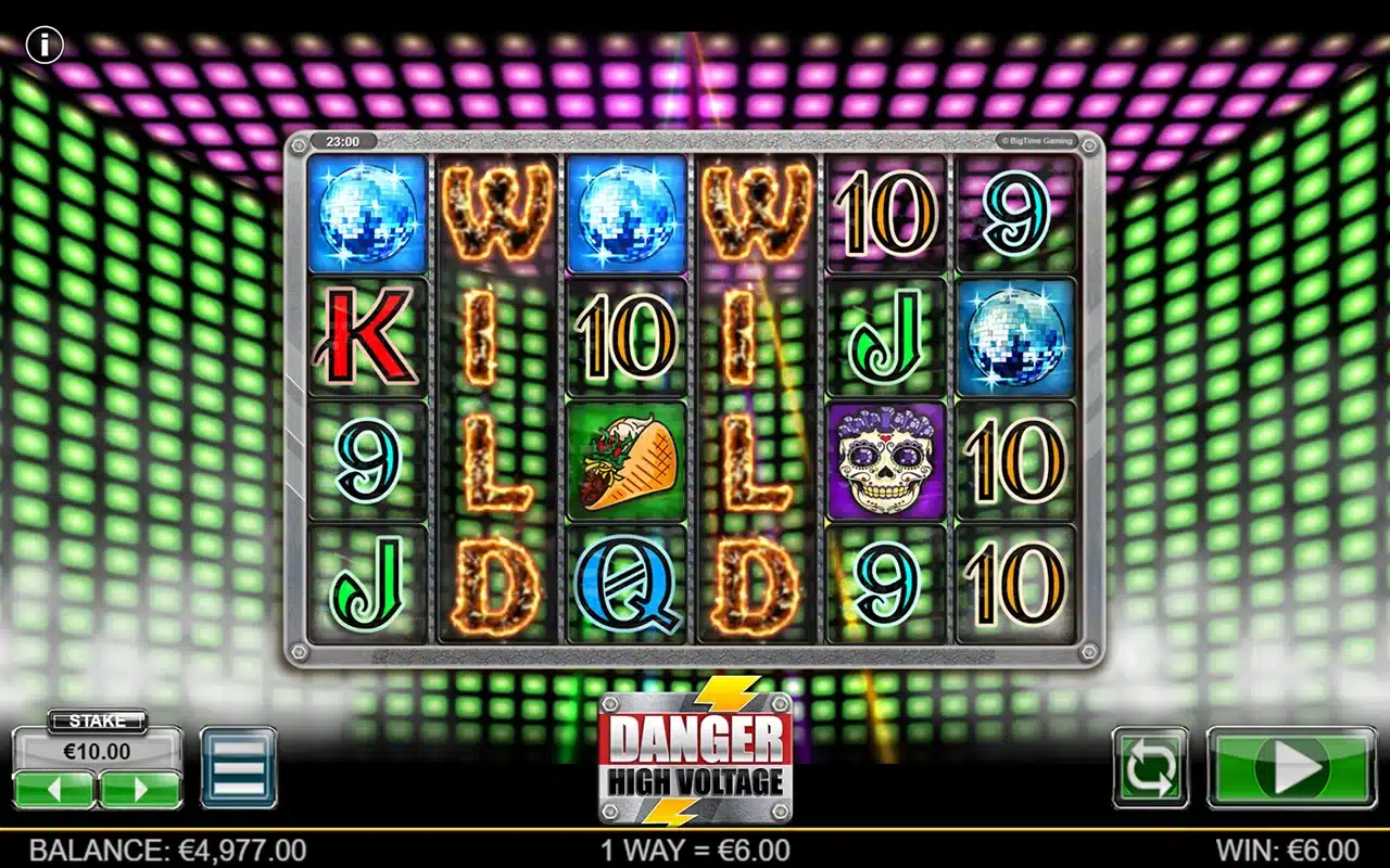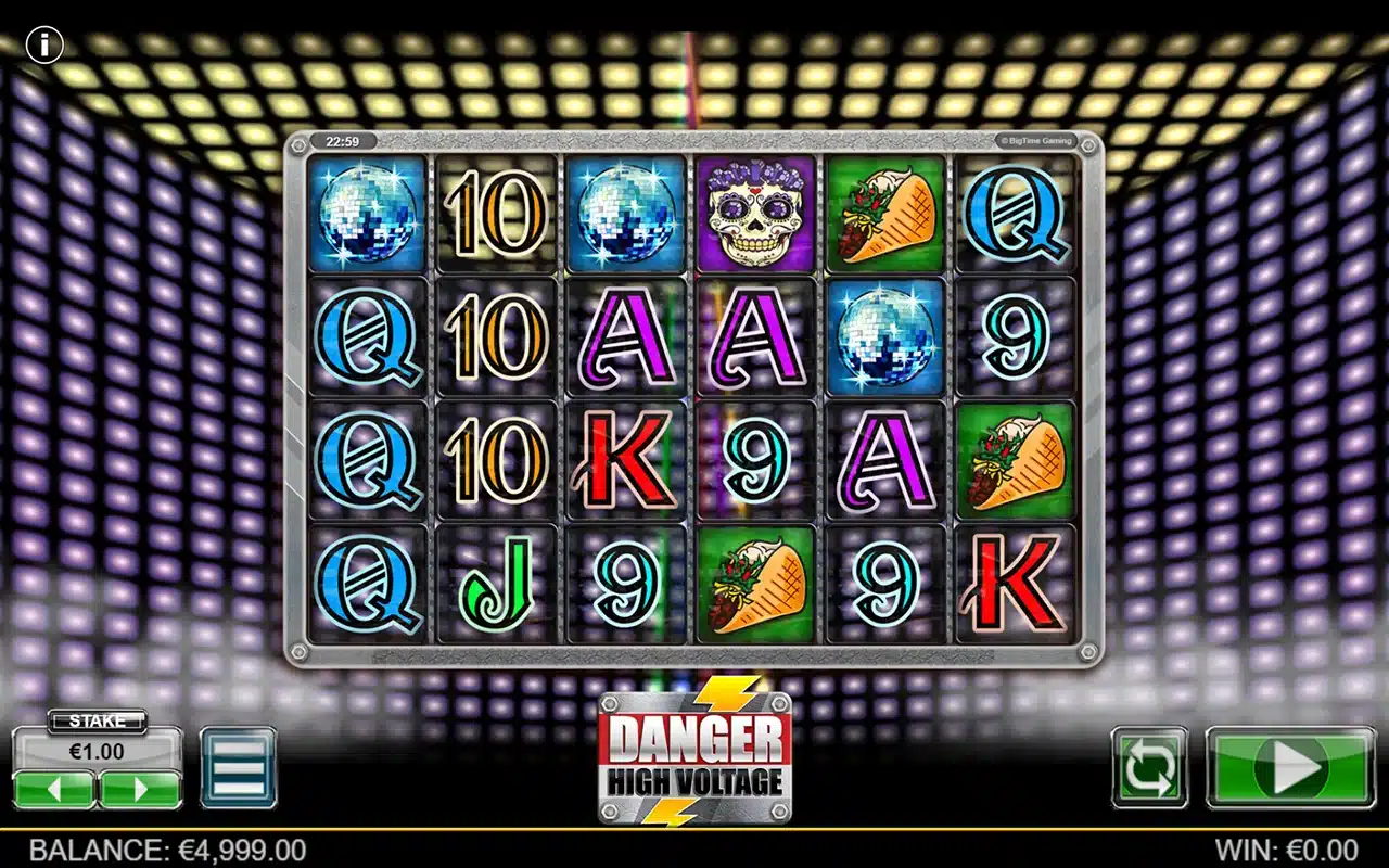 Danger High Voltage створений у 2017 році, вирізняється нестандартною сіткою 6×4 та 4096 способами виграшу. Гра має високу волатильність, RTP 95.67% і діапазон ставок від 0,20 до 40. Шалене поєднання електричного драйву, рок-н-ролу та клубної естетики 90-х: неонові черепи, дзеркальні кулі, палаючі написи та ритми, що б’ють струмом кожен спін.