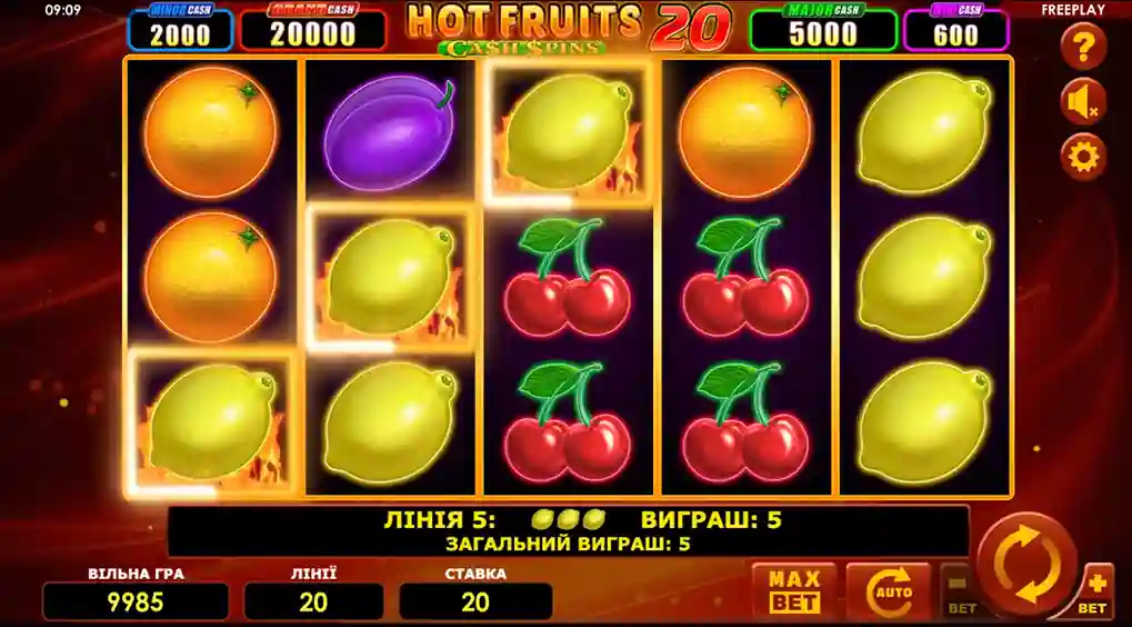 4. Запустіть гру – натисніть на іконку Hot Fruits 20. Система запропонує вибрати режим: демо (безкоштовна гра) або на гроші. Для початку можна обрати демоверсію, щоб ознайомитися з автоматом без ризику.